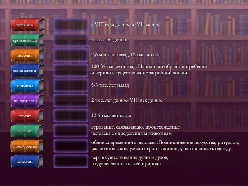 палеолит - 2,6 млн.лет назад-12 тыс. до н.э., мезолит - 12-5 тыс. лет назад, неолит - 5-3 тыс. лет назад, энеолит - 3 тыс. лет до н.э., эпоха бронзы - 2 тыс. лет до н.э.- VIII век до н.э., эпоха железа - с VIII века до н.э. по VI век н.э., неандерталец - 100-35 тыс.лет назад. Исполняли обряды погребения и верили в существование загробной жизни, кроманьонец - облик современного человека. Возникновение искусства, ритуалов, развитие языков, умели строить жилища, изготавливать одежду, анимизм - вера в существование души и духов, в одушевленность всей природы, тотемизм - верование, связывающее происхождение человека с определенным животным,