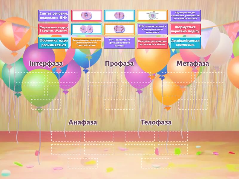 Інтерфаза: , Ріст, розвиток та функціонування клітини, Синтез речовин, подвоєння ДНК, Профаза: ДНК компактизується в двохроматидні хромосоми, , Формується веретено поділу, Центріолі розходяться до полюсів клітини, Оболонка ядра розчиняється, Метафаза: , Двохроматидні хромосоми розташовуються на екваторі клітини, Анафаза: , Однохроматидні хромосоми розходяться до полюсів клітини, Телофаза: Деспіралізуються хромосоми. , Формування ядерця і ядерних оболонок, ,