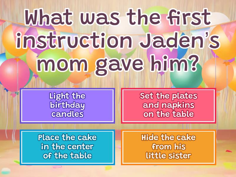 1) What was the first instruction Jaden’s mom gave him? a) Light the birthday candles b) Set the plates and napkins on the table c) Place the cake in the center of the table d) Hide the cake from his little sister 2) Why did Jaden repeat the instructions back to his mom? a) To make sure he understood them correctly b) To show off his memory skills c) Because he didn’t want to do the task d) To confuse his mom 3) What happened to the cake at the end of the story? a) Jaden dropped it on the floor b) His mom put it away for later c) His little sister took it and ate some d) It disappeared without a trace 4) What step did Jaden decide to add at the end? a) Lighting the candles right away b) Keeping an eye on the cake c) Putting the cake in the fridge d) Eating the cake before his sister could take it