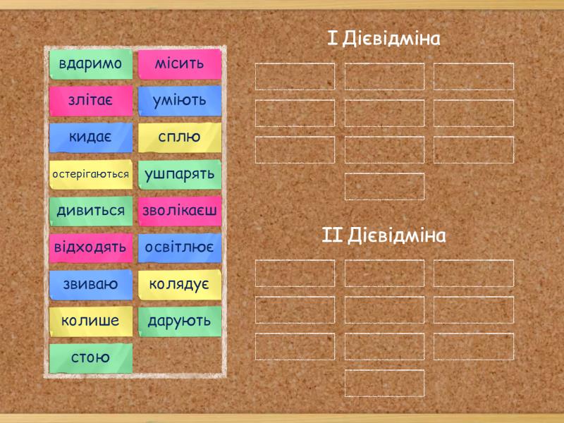 І Дієвідміна: освітлює, звиваю, колядує, зволікаєш, дарують, злітає, кидає, остерігаються, колише, уміють, ІІ Дієвідміна: сплю, місить, вдаримо, ушпарять, дивиться, стою, відходять,