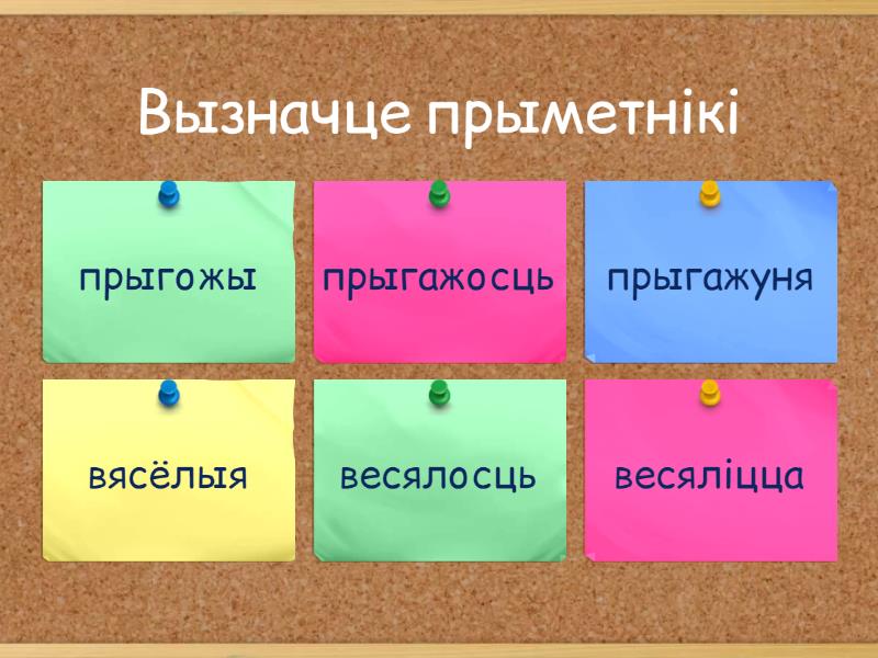 1) Вызначце прыметнікі a) прыгожы b) прыгажосць c) прыгажуня d) вясёлыя e) весялосць f) весяліцца 2) Вызначы, якіх словаў не хапае ў правіле: "Прыметнікі - гэта словы, якія абазначаюць прыметы прадметаў і адказваюць на пытанні якія? які? ...? ...??" a) якія? b) што? c) хто? d) якая? 3) Знайдзі спалучэнне "назоўнік+прыметнік" у сказе: Далёкая старана без ветру сушыць. a) без ветру b) сушыць без ветру c) старана без ветру d) далёкая старана 4) Знайдзі спалучэнне "назоўнік+прыметнік" у сказе: Вясенні дзень год корміць. a) корміць год b) вясенні дзень c) дзень корміць d) вясенні корміць 5) Вызначы, у якім радзе правільна падабраны аднакаранёвыя прыметнікі да назоўнікаў у дужках a) (Сонца) раніца - сонечная раніца b) (Зіма) дзень - зімні дзень c) (Сасна) дзверы - сасонныя дзверы d) (Гара) возера - азёрная гара 6) Вызначы радок, у якім правільна вызначаны род прыметнікаў: a) рыжая (ж.р.) - вавёрка b) рыжая (м.р.) вавёрка c) лёгкі (н.р.) - ветрык d) лёгкі (м.р.) - ветрык 7) Вызначы, якія канчаткі трэба пісаць, калі далучыць да прыметніка зялёны назоўнік поле a) ае b) ы c) ая d) ыя 8) Вызначы, якія канчаткі трэба пісаць, калі далучыць да прыметніка зялёны назоўнік яблык a) ае b) ы c) ая d) ыя 9) Вызначы, якія канчаткі трэба пісаць, калі далучыць да прыметніка зялёны назоўнік трава a) ае b) ы c) ая d) ыя 10) Вызначы, якія канчаткі трэба пісаць, калі далучыць да прыметніка зялёны назоўнік ліхтарыкі a) ае b) ы c) ая d) ыя