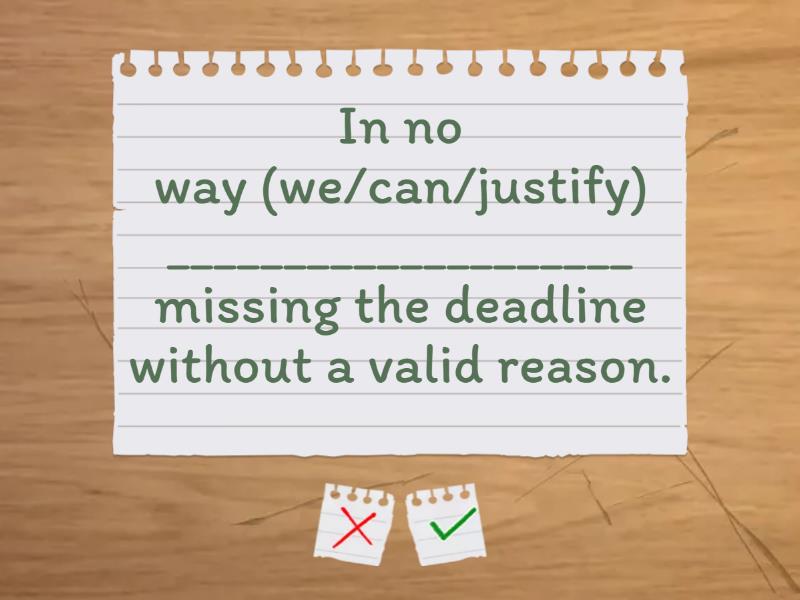 Under no circumstances (we/should/compromise) ____________________ the quality of our product for a quicker release. - Under no circumstances should we compromise the quality of our product for a quicker release., At no point (we/consider) ____________________ cutting costs that would affect our employees’ welfare last decade. - At no point did we consider cutting costs that would affect our employees’ welfare last decade., In no way (we/can/justify) ____________________ missing the deadline without a valid reason. - In no way can we justify missing the deadline without a valid reason., Not only (we/need) ____________________ to meet our sales targets, but we also must ensure customer satisfaction. - Not only do we need to meet our sales targets, but we also must ensure customer satisfaction., Not without careful thought (decisions about all potential outcomes/make) ______________________________________. - Not without careful thought should be/were/have been decisions about all potential outcomes made., Rarely (I/encounter) ____________________ a challenge that our team cannot overcome. - Rarely do I encounter a challenge that our team cannot overcome., Little (we/know) ____________________ that the market trends would shift so rapidly, affecting our strategy. - Little did we know that the market trends would shift so rapidly, affecting our strategy., (Give) ____________________ the circumstances, pivoting our approach was the best course of action. - Given the circumstances, pivoting our approach was the best course of action., After (finish) ____________________ the quarterly report, we noticed an opportunity for significant cost savings. - After finishing the quarterly report, we noticed an opportunity for significant cost savings., (make) ____________________ all the preparations, we can now focus on scaling up our operations. - Having made all the preparations, we can now focus on scaling up our operations., (Be) ____________________ a good entrepreneur I recognize when to take risks and when to be cautious. - Being a good entrepreneur I recognize when to take risks and when to be cautious., (Enter) ____________________ the office, I could sense the excitement about the upcoming product launch. - Having entered/entering the office, I could sense the excitement about the upcoming product launch., When (ask) ____________________ a difficult question, it’s important to remain calm and provide a thoughtful response. - When asked a difficult question, it’s important to remain calm and provide a thoughtful response.,