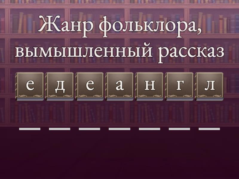 легенда - Жанр фольклора, вымышленный рассказ , пословица  - Краткое, мудрое изречение, которое содержит в себе законченный смысл и мораль, то есть поучение., загадка - Небольшое литературное произведение, в котором описывается какой-либо предмет или явление, но сам предмет или явление не называется., скороговорка - Фольклорный жанр, в котором используется быстрая речь, песня - Малый лирический жанр, в котором поэтический текст неразрывно связан с мелодией, небылица - Малый жанр фольклора, смешная сказка или стишок, в которой искажена действительность, заклички - Короткие песенки, в которых сохранились отголоски древних заклинаний,