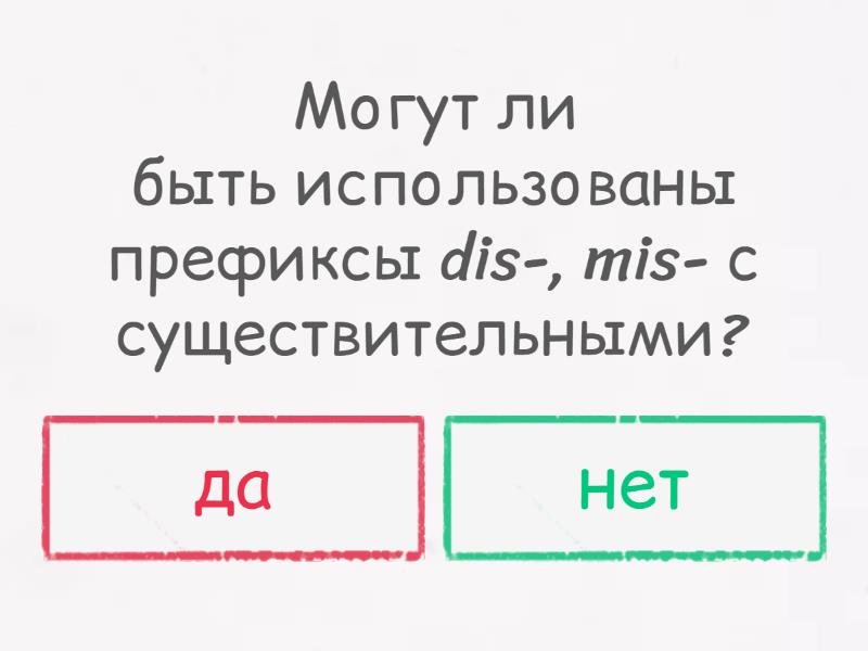 1) Могут ли быть использованы префиксы dis-, mis- с существительными? a) да b) нет 2) Могут ли быть использованы префиксы dis-, mis- с глаголами? a) да b) нет 3) Могут ли быть использованы префиксы dis-, mis- с прилагательными? a) да b) нет 4) Могут ли быть использованы префиксы dis-, mis- с наречиями? a) да b) нет 5) Могут ли быть использованы префиксы il-, ir- с существительными? a) да b) нет 6) Могут ли быть использованы префиксы il-, ir- с глаголами? a) да b) нет 7) Могут ли быть использованы префиксы il-, ir- с прилагательными? a) да b) нет 8) Могут ли быть использованы префиксы il-, ir- с наречиями? a) да b) нет 9) Могут ли быть использованы префиксы in-, im- с существительными? a) да b) нет 10) Могут ли быть использованы префиксы in-, im- с глаголами? a) да b) нет 11) Могут ли быть использованы префиксы in-, im- с прилагательными? a) да b) нет 12) Могут ли быть использованы префиксы in-, im- с наречиями? a) да b) нет 13) Могут ли быть использованы префикс un- с существительными? a) да b) нет 14) Могут ли быть использованы префикс un- с глаголами? a) да b) нет 15) Могут ли быть использованы префикс un- с прилагательными? a) да b) нет 16) Могут ли быть использованы префикс un- с наречиями? a) да b) нет 17) С какой частью речи могут быть использованы префиксы re-, over-, under-? a) с существительными b) с глаголами c) с прилагательными d) с наречиями 18) С какой частью речи могут быть использованы префиксы inter-, non-, post-, pre-? a) с существительными b) с глаголами c) с прилагательными d) с наречиями 19) Могут ли быть использованы префиксы, меняющие значение слова (то есть не отрицательные), для таких частей речи как глаголы и прилагательные? a) да b) нет 20) Могут ли быть использованы префиксы, меняющие значение слова (то есть не отрицательные), для таких частей речи как существительные и наречия? a) да b) нет 21) Какие суффиксы проверяются у глаголов? a) -ise/ -ize b) -ed c) -ing d) -en e) -ify f) -ate 22) Какой/какие суффикс/ы НЕ проверяе/ются у существительных? a) -ance/-ence b) -ist c) -ity d) -ing e) -hood f) -er/-or 23) Какой/какие суффикс/ы НЕ проверяе/ются у существительных? a) -ment b) -ness c) -ship d) -sion/-tion  e) -dom f) -er/-or 24) Какой/какие суффикс/ы НЕ проверяе/ются у прилагательных? a) -ment b) -able/-ible c) -al d) -ed e) -ese f) -ary 25) Какой/какие суффикс/ы НЕ проверяе/ются у прилагательных? a) -ful b) -less c) -ian/-an d) -ical e) -en f) -ing 26) Какой/какие еще суффикс/ы проверяе/ются у прилагательных? a) -ish b) -ive c) -like d) -ly e) -y f) -ous 27) Какой суффикс образует наречие? a) -y b) -ly c) -ward d) -wise