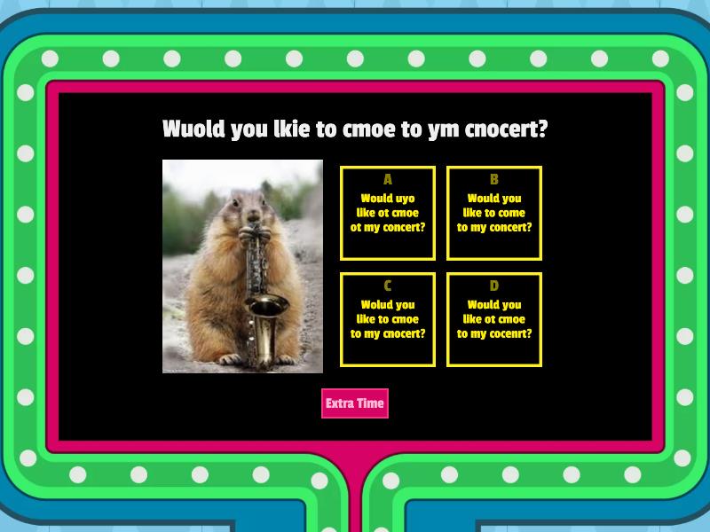 1) Would you like to _______? a) come to my graduation b) come to my birthday party c) come to my concert d) go see a movie 2) Would you like to ______? a) play the piano b) take a picture c) go see a movie d) come to my birthday party 3) Would you like to _________? a) come to my graduation b) play the piano c) take a picture d) come to my concert 4) Sure, __________. a) I'd love to b) I can't c) I will not d) I wish 5) Sorry, _________. a) I am busy b) I have a piano lesson c) I'd love to but I can't d) Congratulations 6) Would come like birthday to my to party you? a) Would you like come to to birthday my party? b) Would you like to come to my birthday party? c) Would like you to birthday come party to my? d) Birthday party come to like my would you? 7) you Would like piano to the play? a) Would you like to play the piano? b) You play the piano would like to? c) Would you play the piano like to? d) Would you like to piano play the ? 8) see a movie Would you like to go? a) See a movie like would you go to? b) Movie like to go see a would you? c) Would you like to go see a movie? d) Would you like see to go a movie? 9) C________s! a) Congratulations! b) Congulartions! c) Cnogrualtonis! d) Conglriotuans! 10) Wulod ouy ikle ot tkae a pcturei ? a) Would uyo like to take a pucitre? b) Wulod you like ot tkae a picture? c) Would you like to take a picture? d) Would you lkie ot take a pciture? 11) Srroy, Id' lvoe ot but I cnat'. a) Sorry, id' love ot but I cant'. b) Sorry, I'd lvoe to btu I cna't. c) Srroy, I'd lvoe to but I cat'n d) Sorry, I'd love to but I can't. 12) Wuold you lkie to cmoe to ym cnocert? a) Would uyo like ot cmoe ot my concert? b) Would you like to come to my concert? c) Wolud you like to cmoe to my cnocert? d) Would you like ot cmoe to my cocenrt?