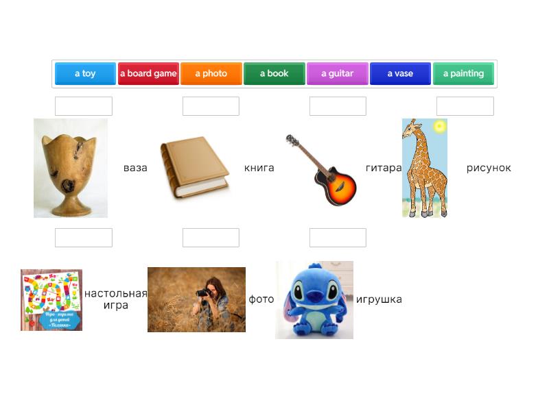 a book - книга, a vase - ваза, a board game - настольная игра, a toy - игрушка, a painting - рисунок, a guitar - гитара, a photo - фото,