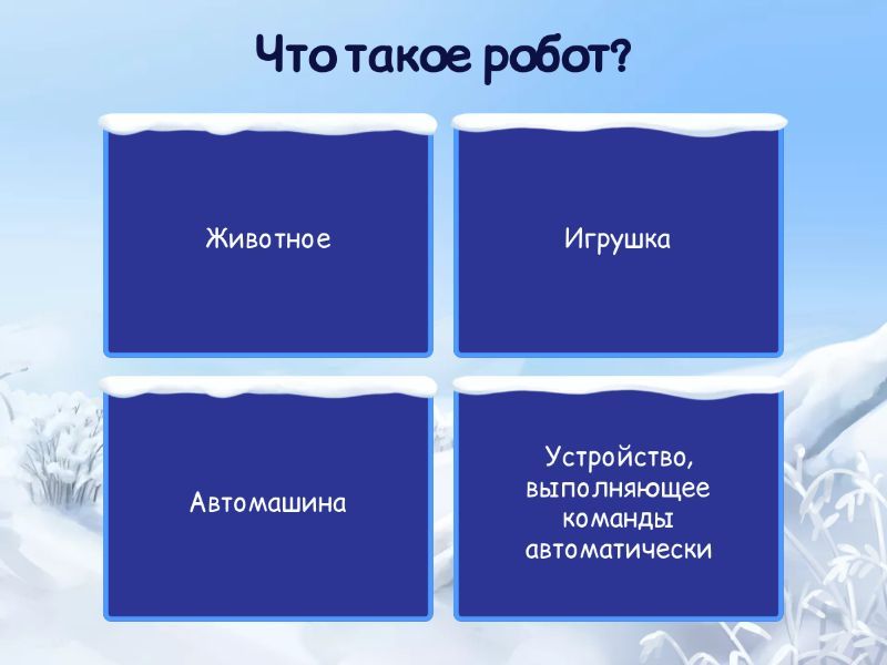 1) Что такое робот? a) Животное b) Игрушка c) Автомашина d) Устройство, выполняющее команды автоматически 2) Что является “мозгом” робота? a) Мотор b) Батарейка c) Контроллер d) Датчик 3) Для чего роботу нужны датчики? a) Украшает робота b) Задаёт последовательность действий робота c) Увеличивает скорость мотора d) Для улыбки 4) Что относится к датчикам? a) Датчик света b) Датчик расстояния c) Датчик наклона d) Всё перечисленное 5) Для чего роботу-светофору нужны датчики? a) Чтобы играть музыку b) Чтобы измерять температуру воздуха c) Чтобы управлять временем сигналов в зависимости от машин d) Измеряет угл 6) Как реагирует робот на свет с помощью датчика? a) Меняет направление движения b) Красит корпус c) Увеличивает батарею d) Играет