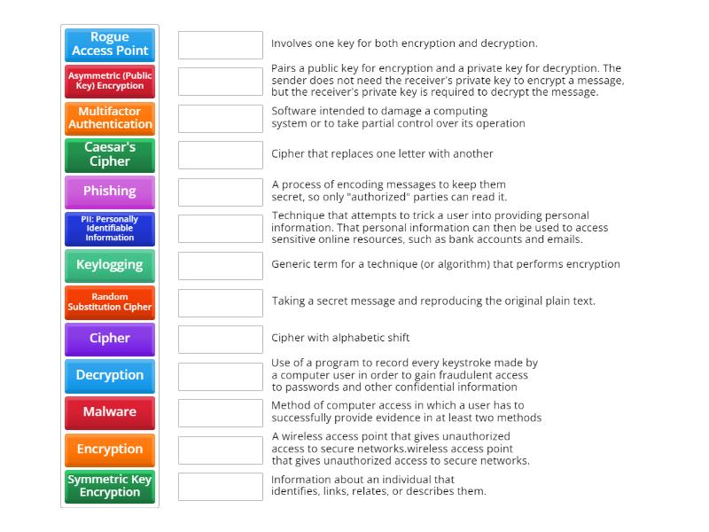Encryption - A process of encoding messages to keep them secret, so only "authorized" parties can read it., Decryption - Taking a secret message and reproducing the original plain text., Symmetric Key Encryption - Involves one key for both encryption and decryption., Asymmetric (Public Key) Encryption - Pairs a public key for encryption and a private key for decryption. The sender does not need the receiver’s private key to encrypt a message, but the receiver’s private key is required to decrypt the message., Cipher - Generic term for a technique (or algorithm) that performs encryption, Caesar's Cipher - Cipher with alphabetic shift, Random Substitution Cipher - Cipher that replaces one letter with another, Keylogging - Use of a program to record every keystroke made by a computer user in order to gain fraudulent access to passwords and other confidential information, Malware - Software intended to damage a computing system or to take partial control over its operation, Rogue Access Point - A wireless access point that gives unauthorized access to secure networks.wireless access point that gives unauthorized access to secure networks., Phishing - Technique that attempts to trick a user into providing personal information. That personal information can then be used to access sensitive online resources, such as bank accounts and emails., PII: Personally Identifiable Information - Information about an individual that identifies, links, relates, or describes them., Multifactor Authentication - Method of computer access in which a user has to successfully provide evidence in at least two methods,