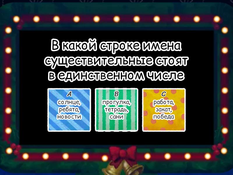 1) Имя существительное – это… a) часть речи, которая обозначает действие предмета b) часть речи, которая обозначает предмет c) часть речи, которая обозначает признак предмета 2) Имя существительное отвечает на вопросы... a) что делает? что сделает? b) кто? что? c) какой? какая? какое? какие? 3) В какой строке имена существительные стоят в единственном числе a) солнце, ребята, новости b) прогулка, тетрадь, сани c) работа, закат, победа 4) Выбери имя существительное a) сахар b) чёрный c) пожелтеть 5) Выбери имена существительные во множественном числе a) сосулька, якорь b) учителя, заморозки c) медведи, белка 6) Выбери одушевленные имена существительные a) вода b) морковь c) ласточка 7) Выберите верное утверждение. Имя существительное - это... a) часть речи, которая обозначает признак предмета b) часть речи, которая обозначает действие предмета c) часть речи,которая обозначает предмет