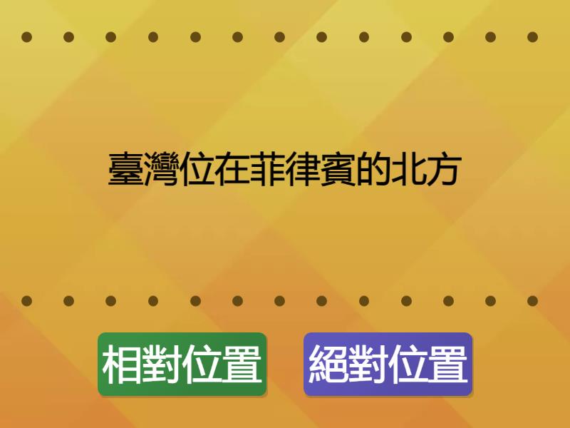相對位置: 臺灣位在菲律賓的北方, 颱風目前位置在臺灣東南方的海面上, 康樂國中的東北方為陽光公園, 雅婷坐在小貞的前面, 恆春是臺灣位置最南的都市, 甲在乙的東方, 絕對位置: 位在 119°E,23.5°N, 臺南市新樂路 76 號, 小明坐在第三排第二列, 佳佳百貨位於好美鎮地圖上(9,H)的位置。, 東經 80°,北緯 20°,