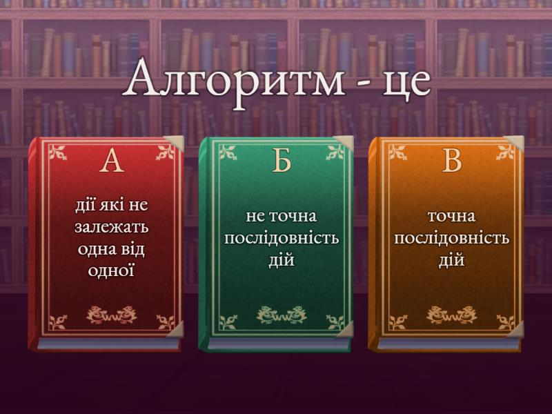 1) Вказівка на виконання певних дій це a) Команда b) Виконавець c) Слово 2) Виконавець команд - це  a) вказівка на виконання певних дій. b) людина яка читає c) природа d) об’єкт, який може виконувати e) команда 3) Які з поданих речень містять вказівку на виконання дій? a) Відкрийте зошити. b) Сьогодні ми переглянемо навчальний фільм. c) Зачени двері d) Увімкніть комп’ютери. e) Ви пам’ятаєте, що завтра ми йдемо в театр? 4) Сукупність команд, які може виконати певний виконавець a) одна команда b) системою команд виконавця c) нескінченність d) алгоритм 5) Алгоритм - це a) точна послідовність дій b) не точна послідовність дій c) дії які не залежать одна від одної 6) Виберіть хто може бути виконавцем a) b) c) d) e) f)