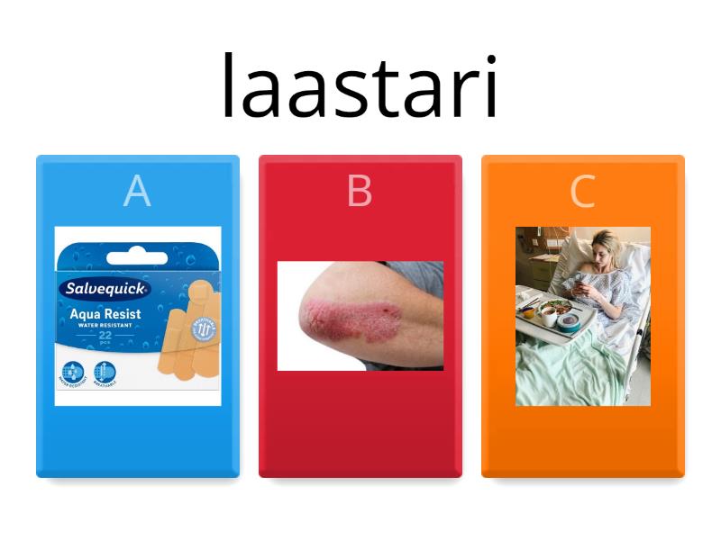 1) laastari a) b) c) 2) lääke a) b) c) 3) allergia a) b) c) 4) ihottuma a) b) c) 5) potilas a) b) c) 6) haava a) b) c) 7) korvatulehdus a) b) c) 8) lääkäri a) b) c) 9) nuha a) b) c) 10) terve a) b) c)