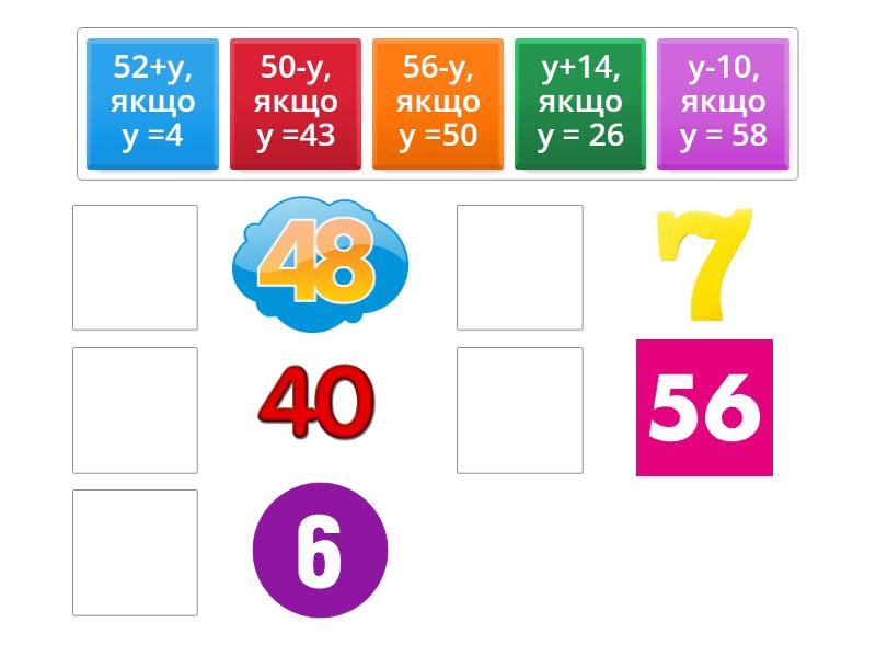 у+14, якщо у = 26, 56-у, якщо у =50, у-10, якщо у = 58, 52+у, якщо у =4, 50-у, якщо у =43,