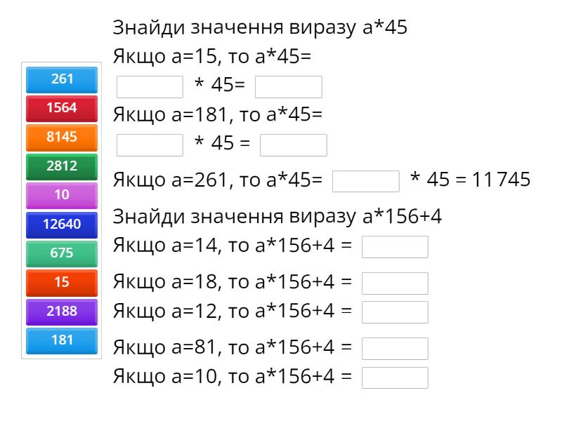 Знайди значення виразу а*45 Якщо а=15, то а*45= ____ * 45= ____ Якщо а=181, то а*45= ____ * 45 = ____ Якщо а=261, то а*45= ____ * 45 = 11 745 Знайди значення виразу а*156+4 Якщо а=14, то а*156+4 = ____ Якщо а=18, то а*156+4 = ____ Якщо а=12, то а*156+4 = ____ Якщо а=81, то а*156+4 = ____ Якщо а=10, то а*156+4 = ____