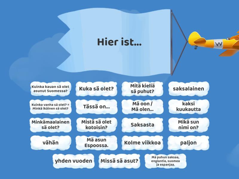 Tässä on... - Hier ist..., Mikä sun nimi on? - Wie heißt du?, Kuka sä olet? - Wer bist du?, Mä oon / Mä olen... - Ich bin ich bin..., Mistä sä olet kotoisin? - Woher kommst du?, Saksasta - aus Deutschland, Minkämaalainen sä olet? - Aus welchem ​​Land kommst du?, saksalainen - Deutsch, Missä sä asut? - Wo wohnst du?, Mä asun Espoossa. - Ich lebe in Espoo., Kuinka kauan sä olet asunut Suomessa? - Wie lange leben Sie schon in Finnland?, Kolme viikkoa - Drei Wochen, yhden vuoden - für ein Jahr, kaksi kuukautta - zwei Monate, Mitä kieliä sä puhut? - Welche Sprachen sprichst du?, Mä puhun saksaa, englantia, suomea ja espanjaa. - Ich spreche Deutsch, Englisch, Finnisch und Spanisch., vähän - wenig, paljon - eine Menge, Kuinka vanha sä olet? = Minkä ikäinen sä olet? - Wie alt bist du,