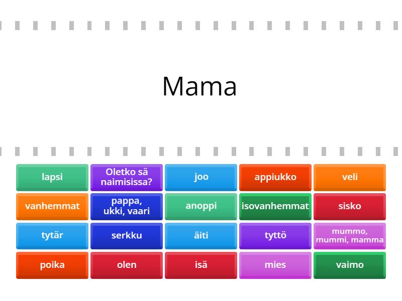äiti - Mama, isä - Vater, vanhemmat - Eltern, isovanhemmat - Großeltern, mummo, mummi, mamma - Oma, Oma, Mama, pappa, ukki, vaari - Papa, Ukki, Vaari, lapsi - Kind, poika - Sohn, tyttö - Mädchen, tytär - Tochter, sisko - Schwester, veli - Bruder, vaimo - Gattin, mies - Mann, serkku - Cousin, anoppi - Schwiegermutter, appiukko - Schwiegervater, Oletko sä naimisissa? - Sind Sie verheiratet?, joo - Ja, olen - Ich bin,