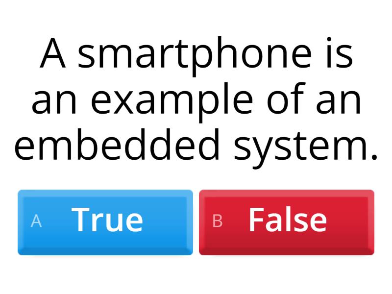 1) A smartphone is an example of an embedded system. a) True b) False 2) Embedded systems are part of a larger device a) True b) False 3) Memory is unlimited in an embedded system. a) True b) False 4) System can be defined as away of working, organising, or performing one or many tasks according to a fixed set of rules, programs,or plans a) True b) False 5) Embedded systems is a combination of hardware and software a) True b) False