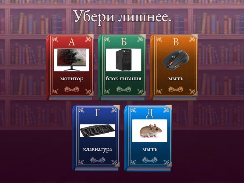 1) Убери лишнее. a) монитор b) клавиатура c) мышь d) мышь e) блок питания 2) Какой носитель информации использовали в древности? a) флешка b) древний камень c) диск d) жесткий диск e) фотоапаарат 3) Используя алфавит, расшифруй буквы. собери из букв слово. 22 1 11 13 a) Файл b) текст c) фото d) флешка e) фильм 4) На каком расстоянии от монитора должен работать ученик за компьютером? a) 15 - 20 см b) 50 - 70 см c) меньше 40см d) 90 - 110 см e) 120см 5) С её помощью в компьютер вводят буквы, цифры и другие знаки. a) мышь b) клавиатура c) принтер d) колонка e) наушник 6) Что нельзя делать в кабинете информатики? a) Бегать b) учится c) слушать учителя d) сидеть ровно e) читать книгу