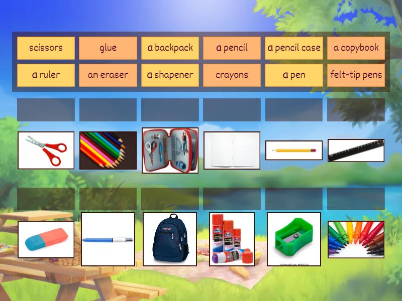а pen, а pencil , а ruler, scissors, glue, an eraser, a copybook , а shapener, crayons, felt-tip pens, а backpack, а pencil case,