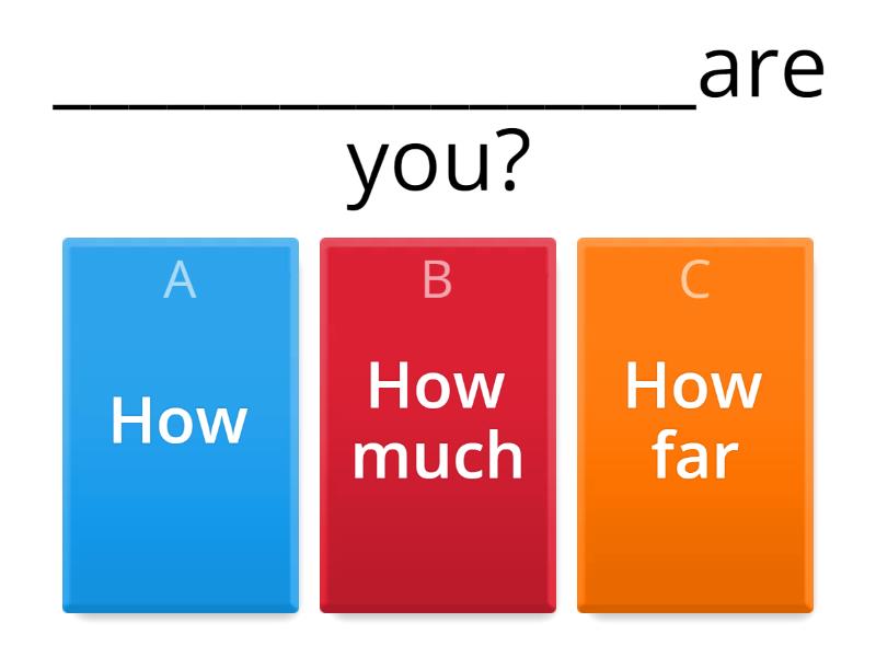 1) _________________are you? a) How b) How much c) How far 2) _________________is the station from your house? a) How b) How much c) How far 3) _________________money do you need? a) How many b) How far c) How much 4) _________________do you visit your grandparents? a) How often b) How far c) How old 5) _________________can I help you? a) How many b) How far c) How 6) _________________ does a pen cost? a) How many b) How far c) How much 7) _________________ do you go to work or school? a) How old b) How c) How many 8) _________________ languages can you speak? a) How much b) How far c) How many 9) _________________ have you lived in your city? a) How far b) How often c) How long 10) _________________ do you exercise or play sports? a) How often b) How many c) How far 11) _________________ siblings do you have? a) How b) How much c) How many 12) _________________ do you eat out at restaurants? a) How often b) How far c) How old 13) _________________ time do you spend watching TV? a) How many b) How old c) How much 14) _________________ are you? a) How much b) How often c) How old 15) _________________ do you celebrate holidays? a) How b) How far c) How many 16) _________________ books did you read this year? a) how much b) How many c) How far 17) _________________ do you know about computers? a) How old b) How much c) How many 18) _________________ do you check your cellphone? a) How many b) How old c) How often 19) _________________ do you spend your free time? a) How old b) How c) How many 20) _________________ is your home from the supermarket? a) How old b) How many c) How far 21) _________________ does a cinema ticket cost in your city? a) How b) How many c) How much 22) _________________ do you take to get ready in the morning? a) How many b) How long c) How old