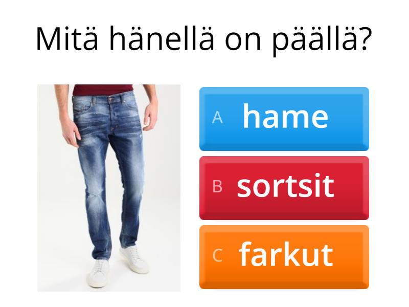 1) Mitä hänellä on päällä? a) hame b) sortsit c) farkut 2) Mitä hänellä on päällä? a) hame b) sortsit c) farkut 3) Mitä hänellä on päällä? a) hame b) sortsit c) farkut 4) Mitä hänellä on päällä? a) kauluspaita b) mekko c) t-paita 5) Mitä hänellä on päällä? a) kauluspaita b) mekko c) t-paita 6) Mitä hänellä on päällä? a) kauluspaita b) mekko c) t-paita 7) Mitä hänellä on päällä? a) housut b) haalari c) toppi 8) Mitä hänellä on päällä? a) housut b) haalari c) toppi 9) Mitä hänellä on päällä? a) housut b) haalari c) toppi 10) Mitä hänellä on päällä? a) pyjama b) puku c) yöpaita 11) Mitä hänellä on päällä? a) pyjama b) puku c) yöpaita 12) Mitä hänellä on päällä? a) pyjama b) puku c) yöpaita 13) Mitä hänellä on päällä? a) aluspaita b) rintaliivit c) bokserit 14) Mitä hänellä on päällä? a) aluspaita b) rintaliivit c) bokserit 15) Mitä hänellä on päällä? a) aluspaita b) rintaliivit c) bokserit 16) Mitä hänellä on päässä? a) pipo b) lakki c) hattu 17) Mitä hänellä on päässä? a) pipo b) lakki c) hattu 18) Mitä hänellä on päässä? a) pipo b) lakki c) hattu 19) Mitä hänellä on päällä? a) kylpytakki b) nahkatakki c) sadetakki 20) Mitä hänellä on päällä? a) kylpytakki b) nahkatakki c) sadetakki 21) Mitä hänellä on päällä? a) kylpytakki b) nahkatakki c) sadetakki 22) Mitä hänellä on päällä? a) villatakki b) villapusero c) huppari 23) Mitä hänellä on päällä? a) villatakki b) villapusero c) huppari 24) Mitä hänellä on päällä? a) villatakki b) villapusero c) huppari 25) Mitä hänellä on jalassa? a) polvisukat b) nilkkasukat c) sukkahousut 26) Mitä hänellä on jalassa? a) polvisukat b) nilkkasukat c) sukkahousut 27) Mitä hänellä on jalassa? a) polvisukat b) nilkkasukat c) sukkahousut 28) Mitä hänellä on jalassa? a) tennarit b) sandaalit c) aamutossut 29) Mitä hänellä on jalassa? a) tennarit b) sandaalit c) aamutossut 30) Mitä hänellä on jalassa? a) tennarit b) sandaalit c) aamutossut