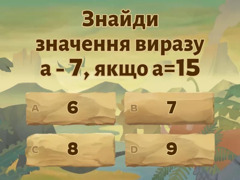 1) Знайди значення виразу а - 7, якщо а=15 a) 6 b) 7 c) 8 d) 9 2) Знайди значення виразу b + 5, якщо b = 8 a) 12 b) 13 c) 16 d) 10 3) Знайди значення виразу c + c, якщо c = 7 a) 14 b) 16 c) 15 d) 13 4) Знайди значення виразу k - 5, якщо k = 12 a) 8 b) 7 c) 5 d) 9 5) Знайди значення виразу c - 9, якщо c = 18 a) 7 b) 8 c) 9 d) 6 6) Знайди значення виразу 25 - c + b, якщо c = 9, b = 5 a) 21 b) 22 c) 19 d) 18