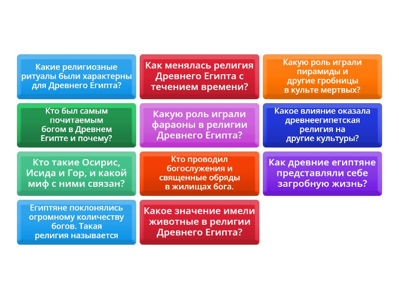 Египтяне поклонялись огромному количеству богов. Такая религия называется - многобожием, или политеизмом., Кто проводил богослужения и священные обряды в жилищах бога. - жрецы, Кто был самым почитаемым богом в Древнем Египте и почему? - Самым почитаемым богом был Ра, бог Солнца. Солнце считалось источником жизни на Земле, поэтому Ра символизировал созидание, порядок и власть., Какую роль играли фараоны в религии Древнего Египта? - Фараоны считались живыми богами на Земле, посредниками между людьми и богами. Они были ответственны за поддержание порядка в мире и общение с божествами., Кто такие Осирис, Исида и Гор, и какой миф с ними связан? - Осирис — бог царства мертвых, Исида — его жена, а Гор — их сын. Миф об Осирисе повествует о его убийстве завистливым братом Сетом, воскрешении Исидой и борьбе Гора за отмщение. Этот миф отражает египетские представления о смерти, загробной жизни и цикличности бытия., Какое значение имели животные в религии Древнего Египта? - Многие животные считались священными и ассоциировались с определенными богами. Например, кошка — животное богини Бастет, а сокол — символ бога Гора., Как древние египтяне представляли себе загробную жизнь? - Египтяне верили в загробную жизнь, где душа умершего могла продолжать существование. Для этого тело мумифицировали и хоронили в гробницах, наполненных предметами, необходимыми в загробном мире., Какую роль играли пирамиды и другие гробницы в культе мертвых? - Пирамиды и гробницы служили последним пристанищем для фараонов и знати. Они были построены с целью обеспечить безопасное путешествие души в загробный мир и сохранить память об умершем., Какие религиозные ритуалы были характерны для Древнего Египта? - К наиболее распространенным ритуалам относились жертвоприношения, молитвы, процессии и мистические обряды., Как менялась религия Древнего Египта с течением времени? - Религия Древнего Египта претерпевала изменения на протяжении тысячелетий, отражая социальные и политические процессы. В разные периоды возвышались культы разных богов, появлялись новые мифы и ритуалы., Какое влияние оказала древнеегипетская религия на другие культуры? - Древнеегипетская религия оказала значительное влияние на развитие религий других народов, особенно в регионе Ближнего Востока. Многие мифы и символы древних египтян нашли отражение в последующих религиозных системах.,
