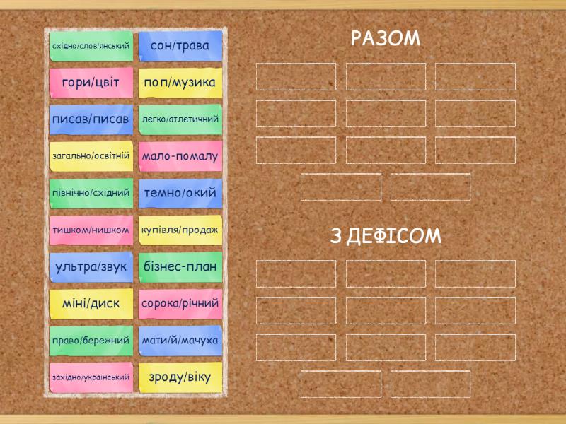 РАЗОМ: сорока/річний, західно/український, міні/диск, легко/атлетичний, загально/освітній, темно/окий, поп/музика, право/бережний, ультра/звук, східно/слов'янський, гори/цвіт, З ДЕФІСОМ: тишком/нишком, писав/писав, бізнес-план, купівля/продаж, мало-помалу, мати/й/мачуха, зроду/віку, північно/східний, сон/трава,