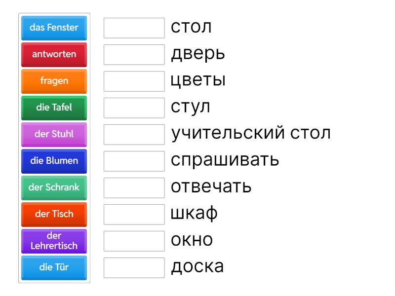 die Tafel - доска, der Tisch - стол, das Fenster - окно, die Tür - дверь, der Schrank - шкаф, die Blumen - цветы, der Lehrertisch - учительский стол, der Stuhl - стул, antworten - отвечать, fragen - спрашивать,