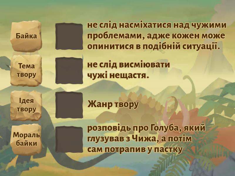 Байка - Жанр твору, Тема твору - розповідь про Голуба, який глузував з Чижа, а потім сам потрапив у пастку, Ідея твору - не слід насміхатися над чужими проблемами, адже кожен може опинитися в подібній ситуації., Мораль байки - не слід висміювати чужі нещастя.,