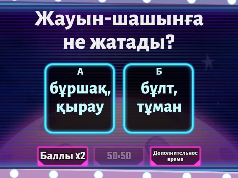 1) Жауын-шашынға не жатады? a)  бұршақ, қырау b) бұлт, тұман 2) Суда еритін заттар a) құм,саз, b) тұз, қант 3) Ауаның қасиеті a) серпіледі, сығылады, жылуды сақтайды b) тыныс аламыз, өсімдікке қажет 4) Қай кезеңдерде құрт пайда болады? a) іріту, қайнату b) ашыту,қайнату, сүзу, кептіру 5) Ауаны ластайтын табиғи құбылыстар a) найзағай, аптап ыстықтан болған өрт b) өнеркәсіп және көлік тұтіні