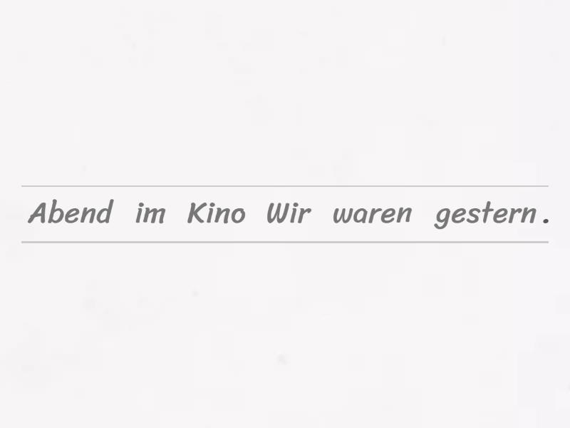 Wir waren gestern Abend im Kino., Meine Großeltern waren im Sommer in der Stadt., Die Computerspiele waren sehr teuer., Die Hausaufgaben waren gestern leicht., Die Kinder waren nach der Schule so müde., Die Blumen im Garten waren wunderschön., Sie waren gestern den ganzen Tag im Bett., Die Bücher in der Tasche waren neu., Die Touristen waren im Museum zu laut., Wir waren im Dezember nicht in der Schule., Die Äpfel waren rot und süß., Wo warst du am Samstag?,
