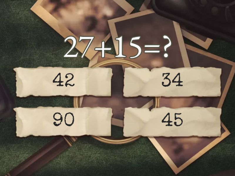 1) 27+15=? a) 42 b) 34 c) 90 d) 45 2) 40-18=? a) 23 b) 22 c) 20 d) 19 3) 9*6=? a) 50 b) 52 c) 54 d) 49 4) 64:8=? a) 6 b) 7 c) 9 d) 5