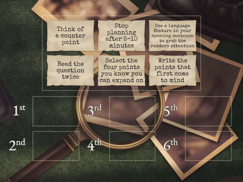 Read the question twice, Write the points that first come to mind, Think of a counter point , Select the four points you know you can expand on, Stop planning after 5-10 minutes, Use a language feature in your opening sentence to grab the readers attention.