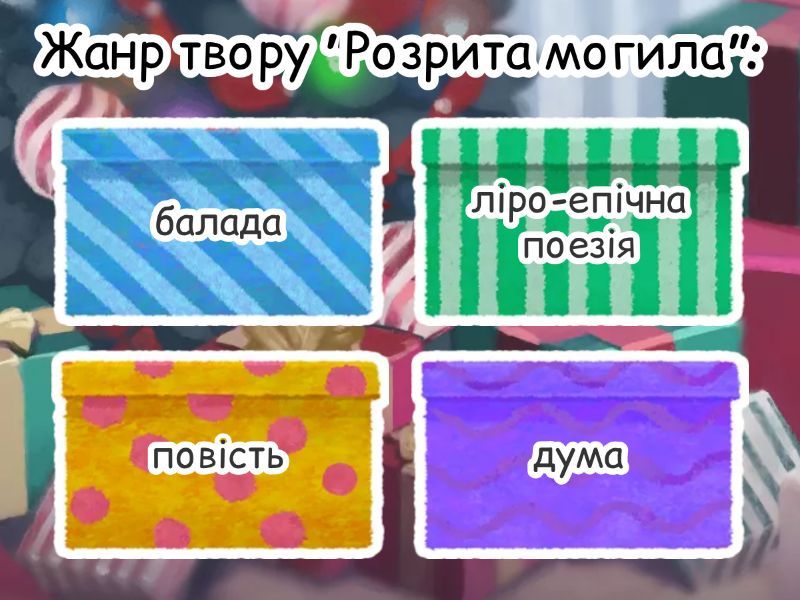 1) Жанр твору "Розрита могила": a) балада b) ліро-епічна поезія c) повість d) дума 2) Головна тема твору "Розрита могила": a) кохання до жінки b) життя селян c) історична доля України d) краса природи 3) Центральний символ у творі "Розрита могила": a) калина b) хрест c) могила d) степ 4) Кого звинувачує Т. Шевченко у трагедії України? a) тільки ворогів b) тільки народ c) ворогів і зрадників d) козаків 5) Основний настрій поезії "Розрита могила": a) оптимістичний b) спокійний c) біль і гнів d) жартівливий 6) Події твору "Захар Беркут" відбуваються у: a) XI ст. b) XII ст. c) XIII ст. d) XIV ст. 7) Головні вороги тухольців: a) турки b) монголо-татари c) поляки d) шведи 8) Захар Беркут у творі — це: a) князь b) воїн c) старійшина громади d) зрадник 9) Провідна ідея твору "Захар Беркут": a) сила грошей b) єдність громади c) особиста слава d) покора владі 10) Що допомогло громаді перемогти ворога? a) згуртованість b) випадок c) допомога князя d) чисельна перевага 11) Головний герой твору "За сестрою": a) Захар b) Павлусь c) Максим d) Остап 12) Мета подорожі Павлуся: a) стати козаком b) знайти скарб c) врятувати сестру d) втікти з дому 13) Події твору "За сестрою" відбуваються в часи: a) визвольної війни b) татаро-турецьких набігів c) Другої світової d) козацьких рад 14) Провідні риси характеру Павлуся: a) хитрість і жадібність b) байдужість c) страх d) сміливість і наполегливість 15) Жанр твору "За сестрою: a) історико-пригодницький b) лірика c) драма d) байка 16) Вам сподобалася вікторина? a) Так b) Ні c) Я і не дивився/дивилася d) Люблю Лесю Григорівну
