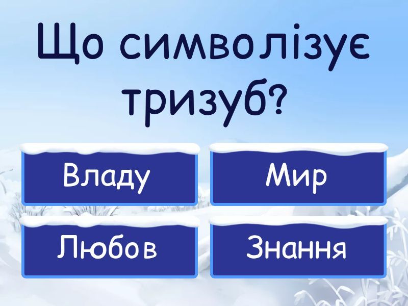 1) Що символізує тризуб? a) Владу b) Мир c) Любов d) Знання 2) Який колір на рушнику символізує життя? a) Червоний b) Синій c) Зелений d) Жовтий 3) Що таке писанка? a) Яйце b) Книга c) Картина d) Скульптура 4) Який матеріал використовують для гончарства? a) Глина b) Дерево c) Метал d) Тканина 5) Що таке килим? a) Тканина b) Картина c) Скульптура d) Книга 6) Що таке вітраж? a) Скло b) Дерево c) Метал d) Тканина 7) Який вид мистецтва є вишивка? a) Текстиль b) Живопис c) Скульптура d) Графіка 8) Що таке фреска? a) Настінний живопис b) Книга c) Скульптура d) Тканина 9) Який матеріал використовують для ікон? a) Дерево b) Метал c) Тканина d) Скло 10) Що таке мозаїка? a) Камінці b) Тканина c) Дерево d) Метал 11) Що таке хоругва? a) Прапор b) Книга c) Скульптура d) Тканина 12) Який вид архітектури є храм? a) Культова b) Житлова c) Громадська d) Промислова