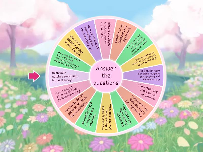 Who is your best friend? What is the most interesting fact you can remember about him?, Who is the oldest member of your family?, What was the most interesting book you read last year?, What is the biggest shopping centre in your city?, Book is the best present. Do you agree?, What was the most expensive present that someone's ever given to you?, What was the most boring subject at school on Monday for you?, Which animal do you thing the most beautiful: whale, lion, wolf / your opinion?, He usually drives a car, but yesterday..., She usually runs in the morning, but yesterday..., She usually draws fruits, but yesterday..., They usually swims in the swimming pool, but yesterday..., He usually sleeps in the bed, but yesterday..., He usually flies by plane on holidays, but yesterday..., They usually sit on the bench in the park, but yesterday..., He usually catches small fish, but yesterday....
