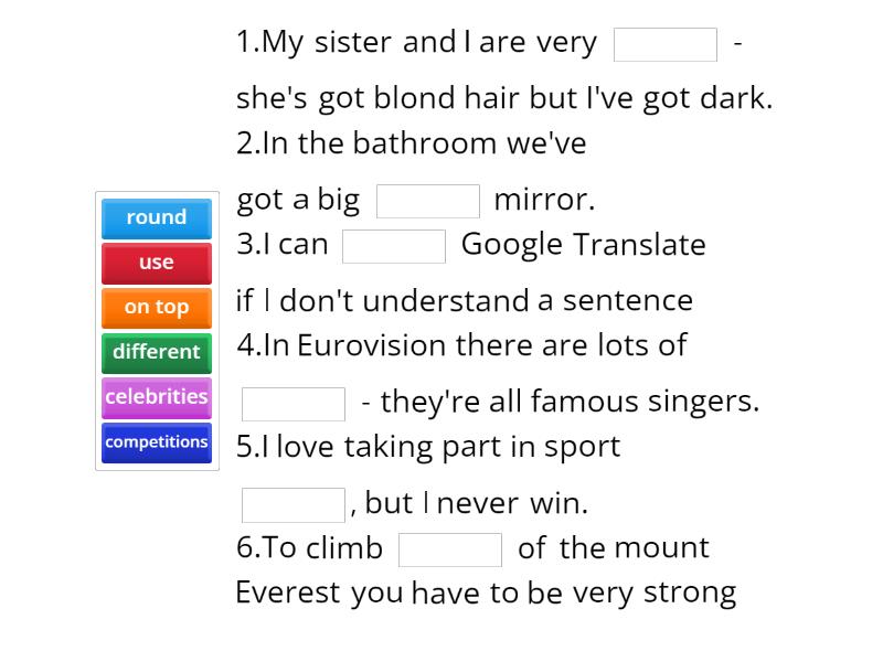 1.My sister and I are very ____ - she's got blond hair but I've got dark. 2.In the bathroom we've got a big ____ mirror. 3.I can ____ Google Translate if I don't understand a sentence 4.In Eurovision there are lots of ____ - they're all famous singers. 5.I love taking part in sport ____, but I never win. 6.To climb ____ of the mount Everest you have to be very strong 1.I made a pretty cake for mum's birthday - it's got strawberries ____. 2.Olympic games is a ____ where lots of people do different sports. 3. Now most of the ____ are bloggers - you can watch them on youtube and they're very famous! 4. I can't ____ my phone - the battery died 5. Some hamsters are so fat that they're ____ like a pancake! 6. Every day I have ____ breakfast - on Monday I had eggs and toast, on Tuesday - some cereal, on Wednesday - just a cup of tea