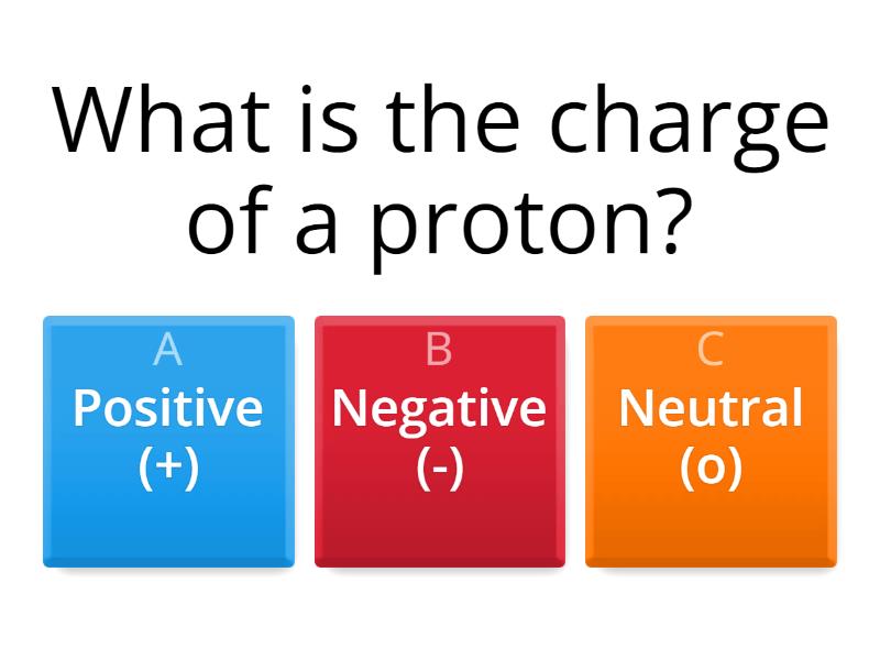 1) What is the charge of a proton? a) Positive (+) b) Negative (-) c) Neutral (o) 2) What is the charge of an electron? a) Positive (+) b) Negative (-) c) Neutral (o) 3) What is the charge of a neutron? a) Positive (+) b) Negative (-) c) Neutral (o) 4) What is the mass of a neutron? a) almost 0 amu b) 1 amu c) 2 amu 5) What is the mass of a proton? a) almost 0 amu b) 1 amu c) 2 amu 6) What is the mass of an electron? a) almost 0 amu b) 1 amu c) 2 amu 7) Where will you find the protons in an atom? a) In the nucleus b) On the energy shells 8) Where will you find the neutrons in an atom? a) In the nucleus b) On the energy shells 9) Where will you find the electrons in an atom? a) In the nucleus b) On the energy shells