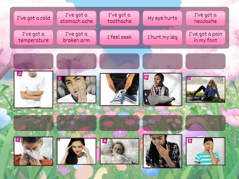 I've got a temperature, My eye hurts, I've got a cold, I've got a headache, I've got a pain in my foot, I feel seek, I hurt my leg, I've got a broken arm, I've got a toothache, I've got a stomach ache,