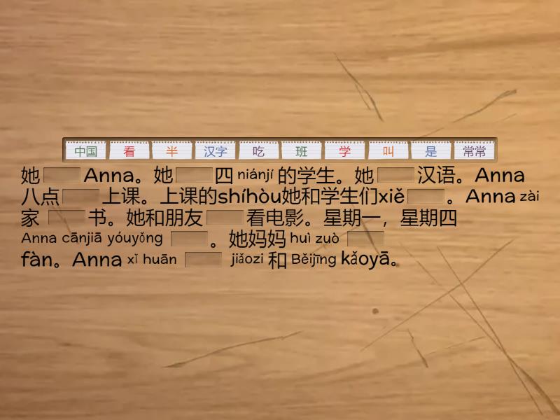 她____Anna。她____四 niánjí 的学生。她____汉语。Anna 八点____上课。上课的shíhòu她和学生们xiě____。Anna zài 家 ____书。她和朋友____看电影。星期一,星期四 Anna cānjiā yóuyǒng ____。她妈妈 huì zuò ____ fàn。Anna xǐ huān ____ jiǎozi 和 Běijīng kǎoyā。