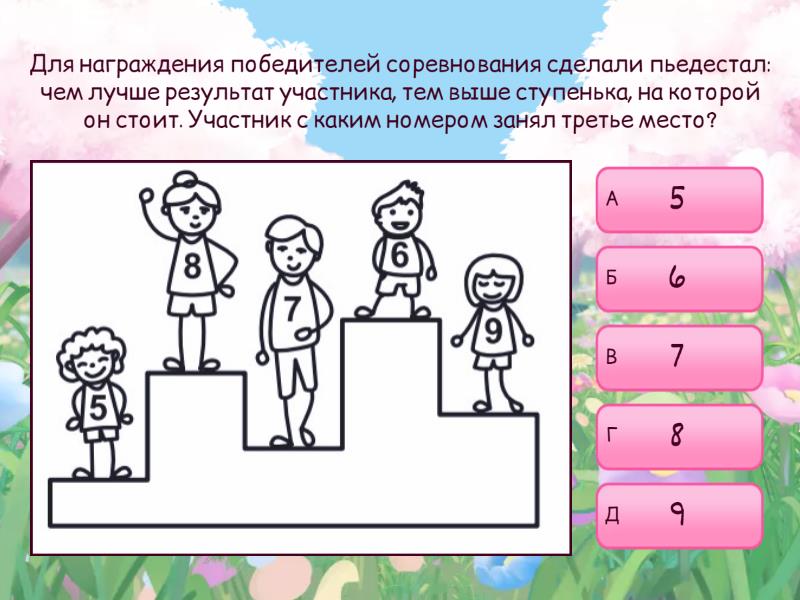 1) Для награждения победителей соревнования сделали пьедестал: чем лучше результат участника, тем выше ступенька, на которой он стоит. Участник с каким номером занял третье место? a) 5 b) 6 c) 7 d) 8 e) 9 2) Какой из кусочков можно вырезать из квадрата слева? a) b) c) d) e) 3) Если вчера была суббота, то какой день недели будет послезавтра? a) вторник b) среда c) пятница d) суббота e) воскресенье 4) Через какую точку придётся пройти Винни-Пуху, двигаясь по стрелочкам, чтобы попасть в гости к Пятачку? a) А b) Б c) В d) Г e) Д 5) Какое из чисел самое маленькое? a) 500005 b) 50050 c) 500050 d) 50005 e) 55000 6) Из цифр 2, 0, 1, 9, используя каждую только один раз, можно составить некоторые даты (число и месяц), например, 09.12. Маша обнаружила, что из этих цифр можно составить день её рождения. Она родилась в октябре. Какого числа она родилась? a) 10 b) 12 c) 19 d) 20 e) 29