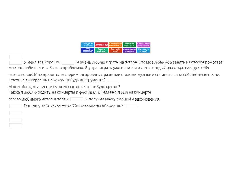 ____ ____ У меня всё хорошо. ____ Я очень люблю играть на гитаре. Это мое любимое занятие, которое помогает мне расслабиться и забыть о проблемах. Я учусь играть уже несколько лет и каждый раз открываю для себя что-то новое. Мне нравится экспериментировать с разными стилями музыки и сочинять свои собственные песни. Кстати, а ты играешь на каком-нибудь инструменте? ____ Может быть, мы вместе сможем сыграть что-нибудь крутое? Также я люблю ходить на концерты и фестивали. Недавно я был на концерте своего любимого исполнителя и ____! Я получил массу эмоций и вдохновения. ____ Есть ли у тебя какое-то хобби, которое ты обожаешь? ____ ____ ____ ____