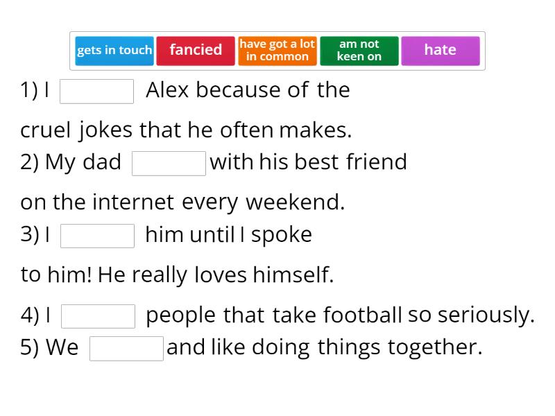 1) I ____ Alex because of the cruel jokes that he often makes. 2) My dad ____with his best friend on the internet every weekend. 3) I ____ him until I spoke to him! He really loves himself. 4) I ____ people that take football so seriously. 5) We ____and like doing things together. 6) I asked Ann to keep my secret, but she ____ and told everybody! 7) Sam ____ people that don't share his interests. 8) Kate ____ Harry and she enjoys his company. 9) We're all good friends in the basketball team and we always ____ together after every match. 10) I started a new school this year, but I ____my classmates quickly and made friends.