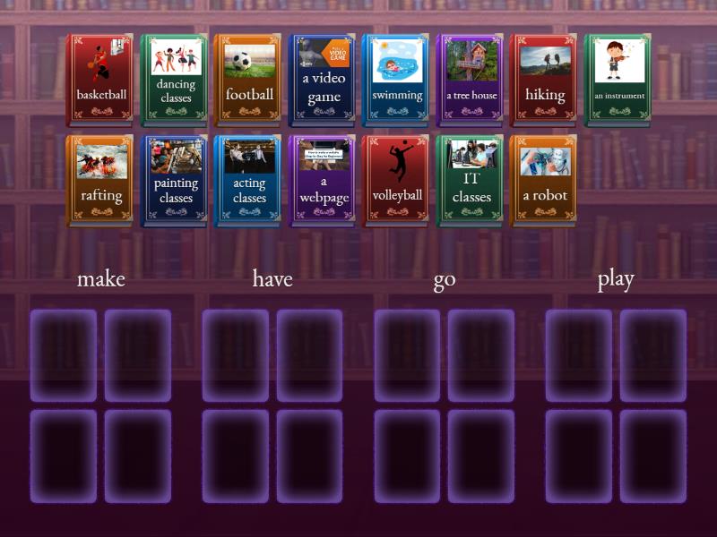 make: a video game, a robot, a webpage, a tree house, have: dancing classes, acting classes, painting classes, IT classes, go: swimming, hiking, rafting, play: volleyball, basketball, football, an instrument,