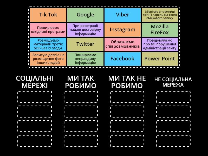 СОЦІАЛЬНІ МЕРЕЖІ: Facebook, Instagram, Tik Tok, Twitter, МИ ТАК РОБИМО: Ображаємо співрозмовників, Розміщуємо матеріали третіх осіб без їх згоди., Поширюємо шкідливі програми, Поширюємо неправдиву інформацію, МИ ТАК НЕ РОБИМО: Повідомляємо про всі порушення адміністрації сайту, Зберігаю в таємниці логін і пароль від свого облікового запису, При реєстрації надаю достовірну інформацію, Запитую дозвіл на розміщення фото інших людей, НЕ СОЦІАЛЬНА МЕРЕЖА: Google, Mozilla FireFox, Power Point, Viber,