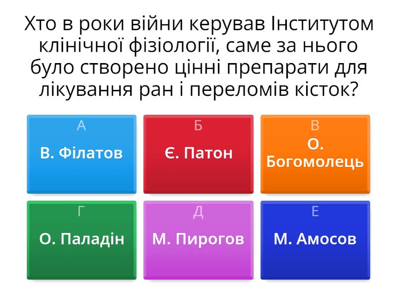1) Хто в роки війни керував Інститутом клінічної фізіології, саме за нього було створено цінні препарати для лікування ран і переломів кісток? a) В. Філатов b) Є. Патон c) О. Богомолець d) О. Паладін e) М. Пирогов f) М. Амосов 2) Який літературно-мистецький тижневик редагує з жовтня 1941 року Олена Теліга у Києві? a) "Факти" b) "Свобода слова" c) "Литаври" d) Прапор перемоги" e) "Київ вечірній" f) "Україка молода" 3) Який інститут очолював Є. Патон в роки війни? a) Інститут біохімії b) Інститут клінічної фізіології c) Інститут електрозварювання d) Інститут клінічної медицини e) Інститут ядерних досліджень f) Політехнічний інститут 4) Хто із письменників брав активну участь у складі партизанських загонів у роки війни? a) В. Сосюра b) П. Тичина c) А. Малишко d) П.Вороний e) Ю. Збанацький f) В. Земляк 5) Вкажіть рік коли під час Другої світової війни було відновлено навчальний процес? a) 1942 b) 1944 c) 1941 d) 1945 e) 1943 f) 1939 6) Із 151 зруйнованого музею по Україні, яку кількість цінних експонатів було вивезено до Німеччини? a) Близько 35 тис. b) Близько 45 тис. c) Близько 20 тис. d) Близько 40 тис. e) Близько 50 тис. f) Близько 80 тис. 7) Хто із поетів та письменників родом із Сумщини зображений на світлині?(Іван Багряний, Павло Тичина, Андрій Малишко, Юрій Яновський). a) Андрій Малишко b) Павло Тичина c) Юрій Яновський d) Микола Вороний e) Іван Багряний f) Олесь Гончар 8) В якому році у Києві відновила свою діяльність Академія наук УРСР? a) 1943 b) 1946 c) 1945 d) 1944 e) 1942 f) 1949 9) За яку кіновтрічку Олександр Довженко у 1943 році був звинувачений у націоналізмі та звільнений від обовязків керівника Київської кіностудії?? a) «Земля» b) "Звенигора" c) "Україна наша радянська" d) "Перемога на Правобережній Україні" e) "Україна в огні" f) "Райдура" 10) Яка кількість евакуйованих у тилові райони українських театрів, музичних та хорових колективів? a) 55 b) 70 c) 60 d) 35 e) 80 f) 75 11) Вкажіть хто із композиторів невтомно працював у роки Другої світової війни? a) Л. Первомайський b) Ю. Збанацький c) Л. Ревуцький d) В. Барвінський e) В. Сосюра f) А. Малишко 12) Що відігравало значну роль у мобілізації населення на боротьбу з нацизмом, та піднесення бойового духу? a) Радіо b) Театр c) Освіта d) Література e) Музика f) Кіно