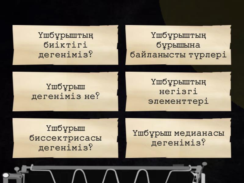 Үшбұрыш дегеніміз не?, Үшбұрыштың негізгі элементтері, Үшбұрыштың бұрышына байланысты түрлері, Үшбұрыш медианасы дегеніміз?, Үшбұрыштың биіктігі дегеніміз?, Үшбұрыш биссектрисасы дегеніміз?,