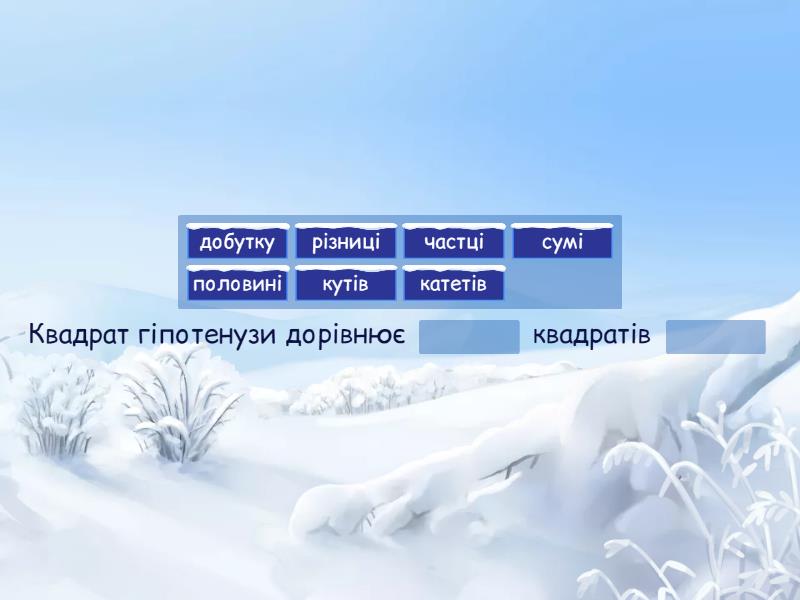 Квадрат гіпотенузи дорівнює ____ квадратів ____