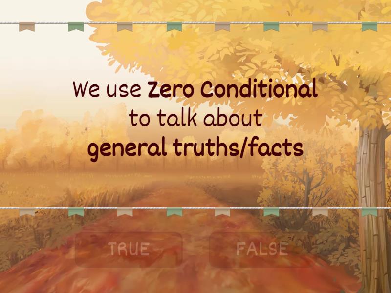 TRUE: We use Zero Conditional to talk about general truths/facts, First Conditional is common when we are talking about possible plans, First Conditional refers to the FUTURE, In the IF CLAUSE we state the CONDITION, In the MAIN CLAUSE we state the RESULT, In First Conditional sentences, the main clause carries WILL/WON'T + infinitive verb, FALSE: In Zero Conditional sentences, we are talking about one specific occasion , We use First Conditional to talk about possible situations in the past, Zero Conditional refers to the FUTURE, We use a comma when we put the MAIN CLAUSE at the beginning,